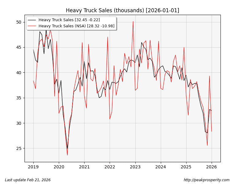 Auto/light truck sales fell to a new 3-year low, and heavy truck sales (not seasonally adjusted) fell back down to pandemic lows. Fun fact I didn’t know: it turns out that companies tend to buy lots of heavy trucks in November. The red line (not seasonally adjusted) vs the black line (adjusted) shows this dynamic. There’s always an HTRUCK spike in November. Regardless of “BOOMING” AI, the heavy truck sales don’t look very good.
