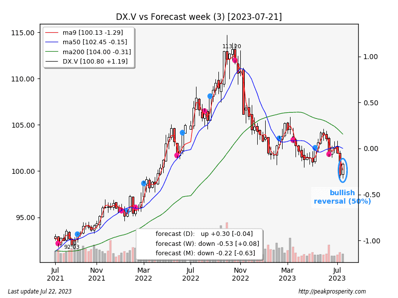 The buck recovered somewhat from last week’s big breakdown; it rose 1.19 (+1.20%) to 100.80, rising 4 out of 5 days, with the largest rally on Thursday. Is everything all better? Technically, no. The buck needs a close above 103 (the previous lower-high) to signal any sort of longer-term recovery. I think the risk right now is to the downside for the buck.